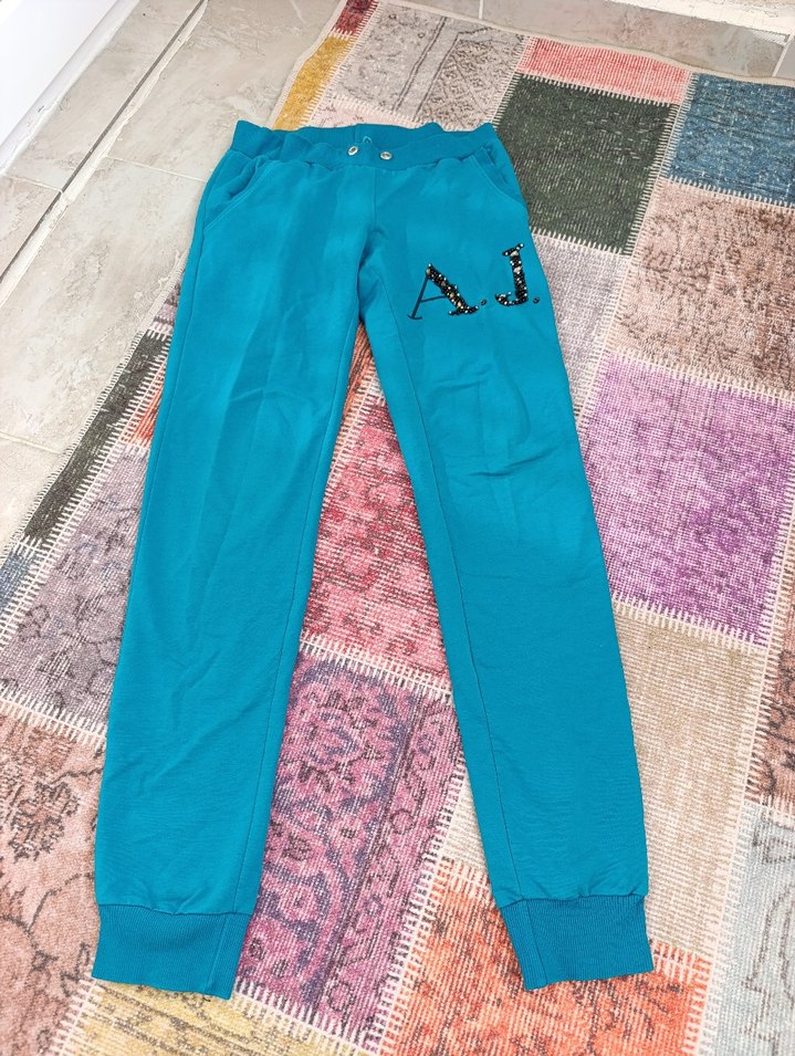 Mavi renkli, sentetik kumaştan, payet detaylı 'A.J' yazılı, rahat kesim kadın eşofmanı. Normal boyda, sokak stiline uygun rahat bir model.