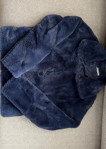 Mavi renkli, peluş kumaştan yapılmış, notlu yakalı uzun kollu, bol kesim ve midi uzunlukta kadın montu, günlük kullanım için uygundur. Kusuru yok