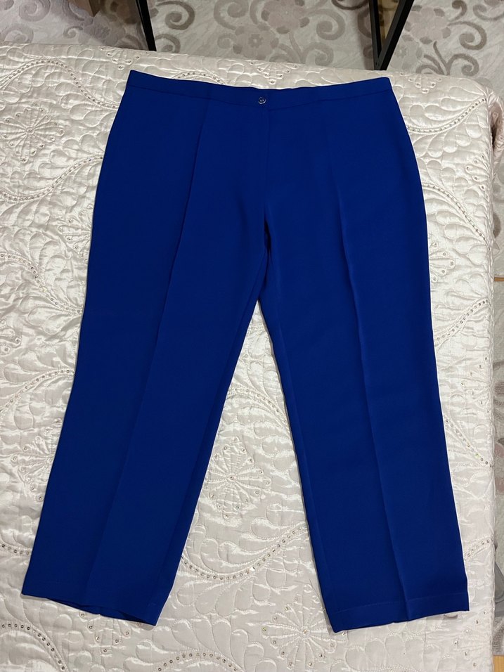 Mavi, parlak sentetik kumaştan, pilili, düz ve desen içermeyen, normal boy midi kesim kadın kumaş pantolon. Ofis kullanımı için uygundur. 48 bedene uygundur. 150-155 boyuna uygundur.