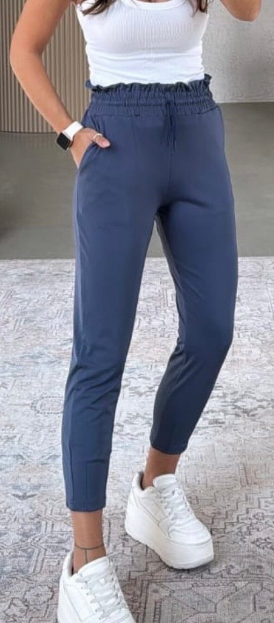 Mavi renkte, rahat kesim ve midi boyda, yumuşak sentetik kumaştan yapılmış kadın spor pantolonu. Açık hava ve sokak stili için zahmetsiz şıklık sunar.