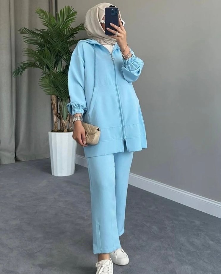 Pastel mavi renkli, bol kesim ve uzun kollu, yakası kesimli kadın eşofman takımı. Yumuşak kumaştan rahat ve şık günlük kullanım için uygun. Kumaştan kaynaklı bir çizgisi var onun dışında hiçbir kusuru yoktur yeni ve etiketlidir fotoğrafda görüldüğü şekildedir.