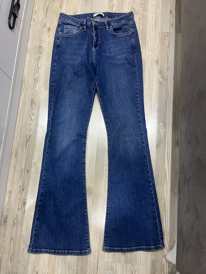 Mavi renkli, regular fit kesim midi boy kadın denim pantolon, parlak dokunuş ve hafif batik desen ile günlük rahat şıklık sunar.