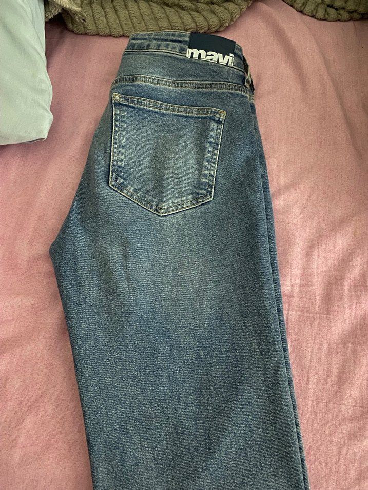 Mavi markalı, regular fit, normal midi boyda mavi kot pantolon. Rahat ve şık, günlük sokak stili için uygun.