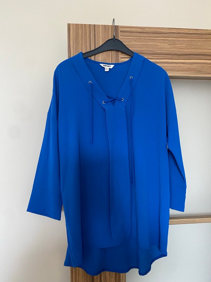 Mavi, uzun kollu, halter yakalı, salaş kesim bluz. İpeksi ve parlak kumaştan, kemerli ve midi boyda, minimalist tarzda günlük kullanım için uygun.