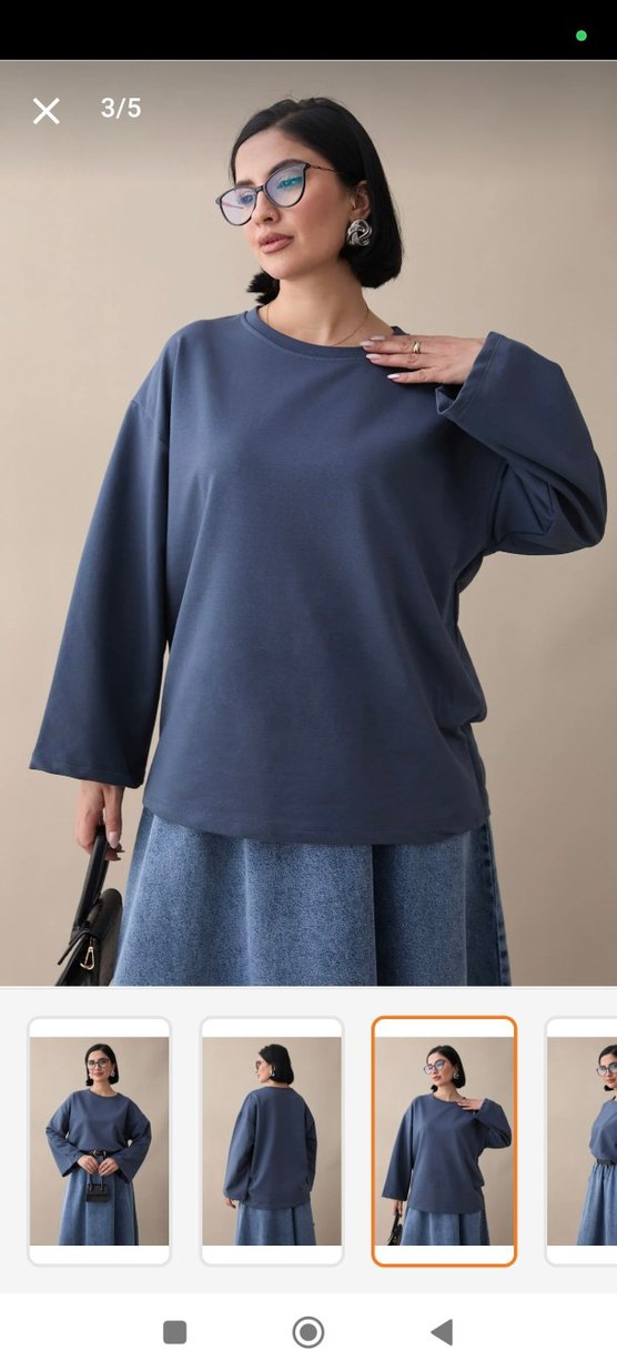 Mavi, yuvarlak yaka, uzun kollu, salaş kesim sweatshirt. Yumuşak denim kumaştan, günlük rahat kullanım için uygun.