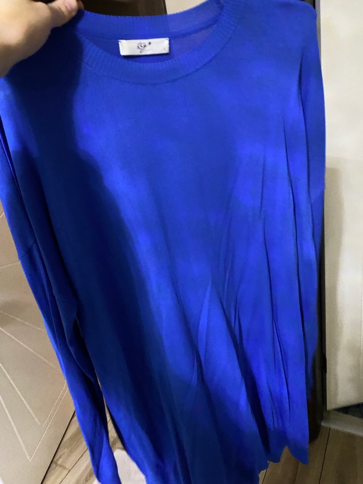 Mavi renkte, uzun kollu ve bisiklet yaka salaş kesim kadın triko. İpeksi kumaştan, drapeli ve midi boyda, günlük kullanıma uygun.
