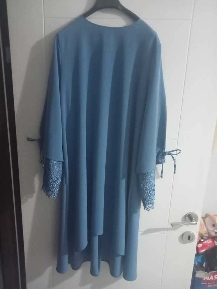 Mavi renkte, uzun boylu, salaş kesim ve kruvaze yaka tunik. Kollar dantel detaylı, sentetik kumaştan üretilmiştir. Günlük kullanıma uygundur.