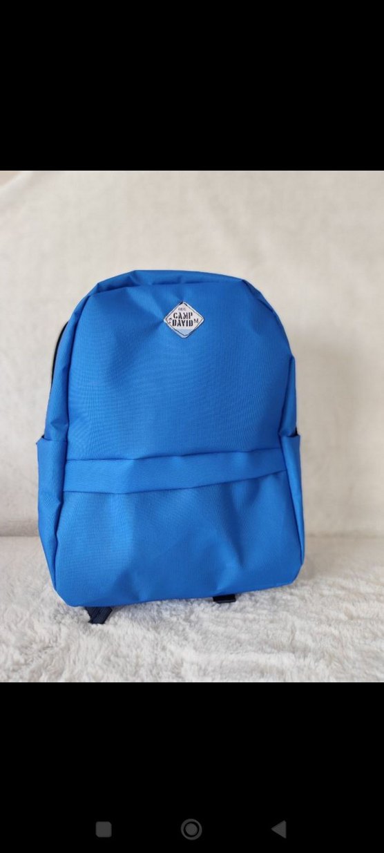 Dayanıklı malzemeden yapılmış, baskılı logolu mavi kadın sırt çantası. Günlük sokak stiline uygun sade ve minimal tasarıma sahip.