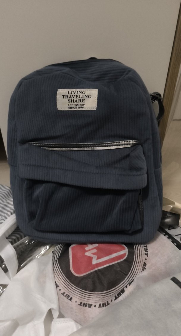 Gri sentetik kumaştan, fermuarlı ve 'LIVING TRAVELING SHARE' yazılı baskılı kadın sırt çantası. Sokak stiline uygun, rahat ve şık.
