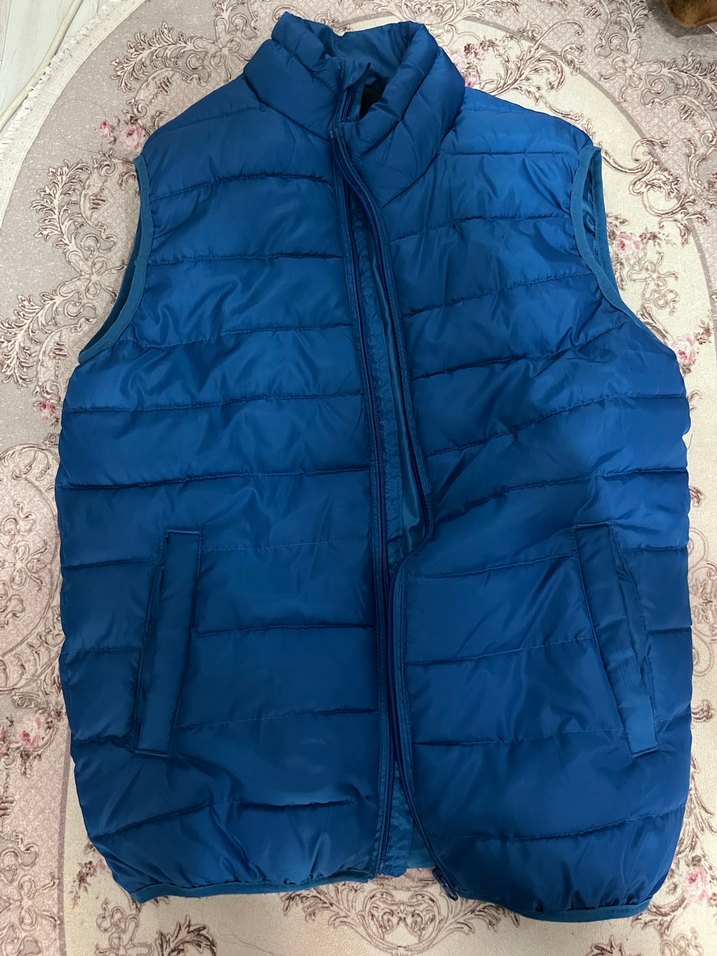 Mavi renkte, yakalı ve fermuarlı, kolsuz şişme yelek. Sentetik kumaştan yapılmış, rahat ve fitted kesim. İki ön cep bulunur, günlük şık kullanım için uygundur.