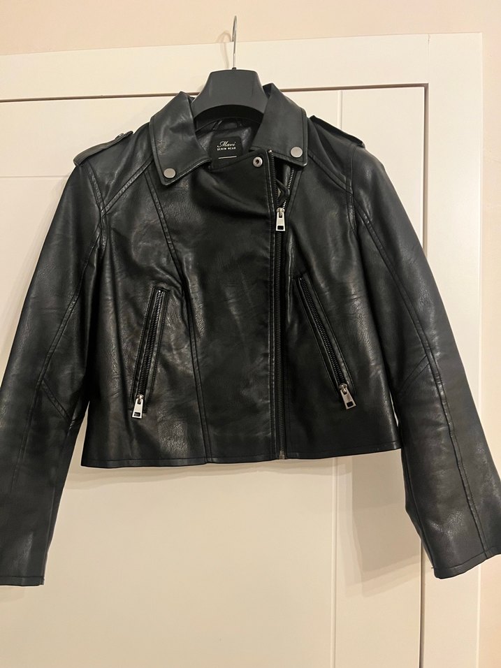 Siyah deri, fitted biker ceket; kesik yakalı, tokalı ve kayışlı kollu. Günlük kullanıma uygun koyu ve desensiz tasarım.