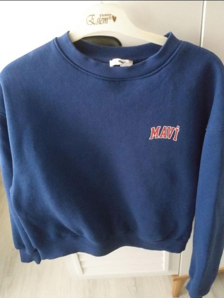 Mavi renkli, bisiklet yaka ve uzun kollu kadın sweatshirt. Rahat kesim, kısa boy ve yumuşak kumaş, "MAVI" baskılı.
