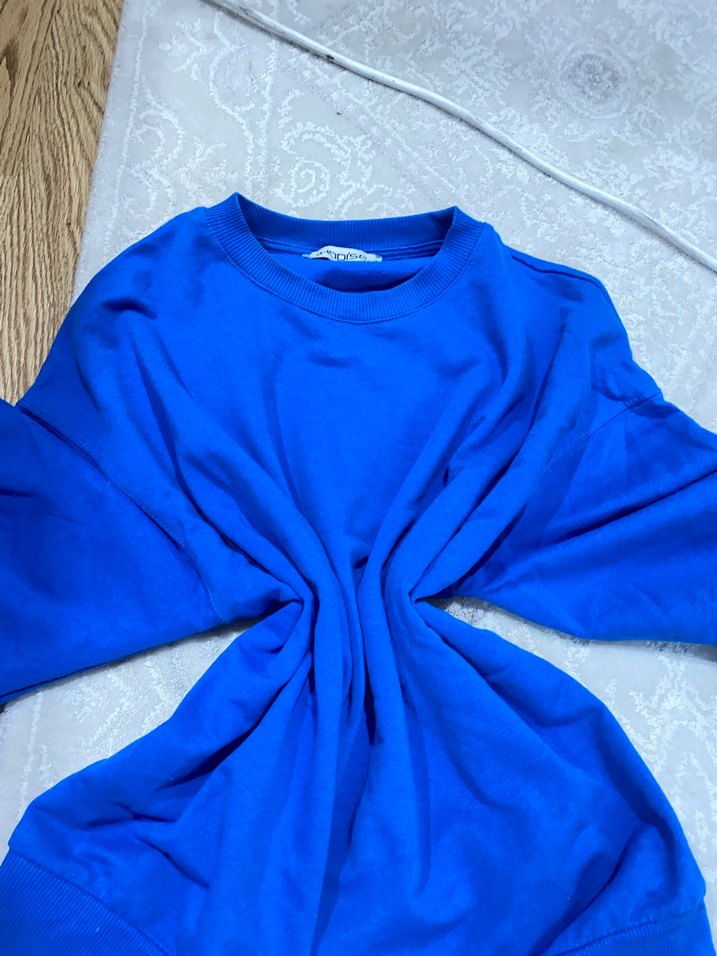 Mavi kadın sweatshirt, yuvarlak yaka ve uzun kollu. Rahat kesimi ve yumuşak, sıcak dokusu ile günlük kullanıma uygun. Düz ve renkli tasarıma sahip, zahmetsiz şıklık sunar.
