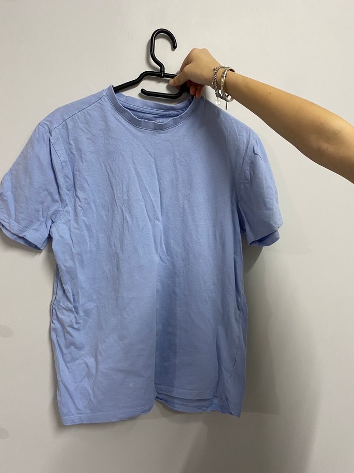 Mavi yuvarlak yaka ve kısa kollu, bol kesim kadın tişörtü.