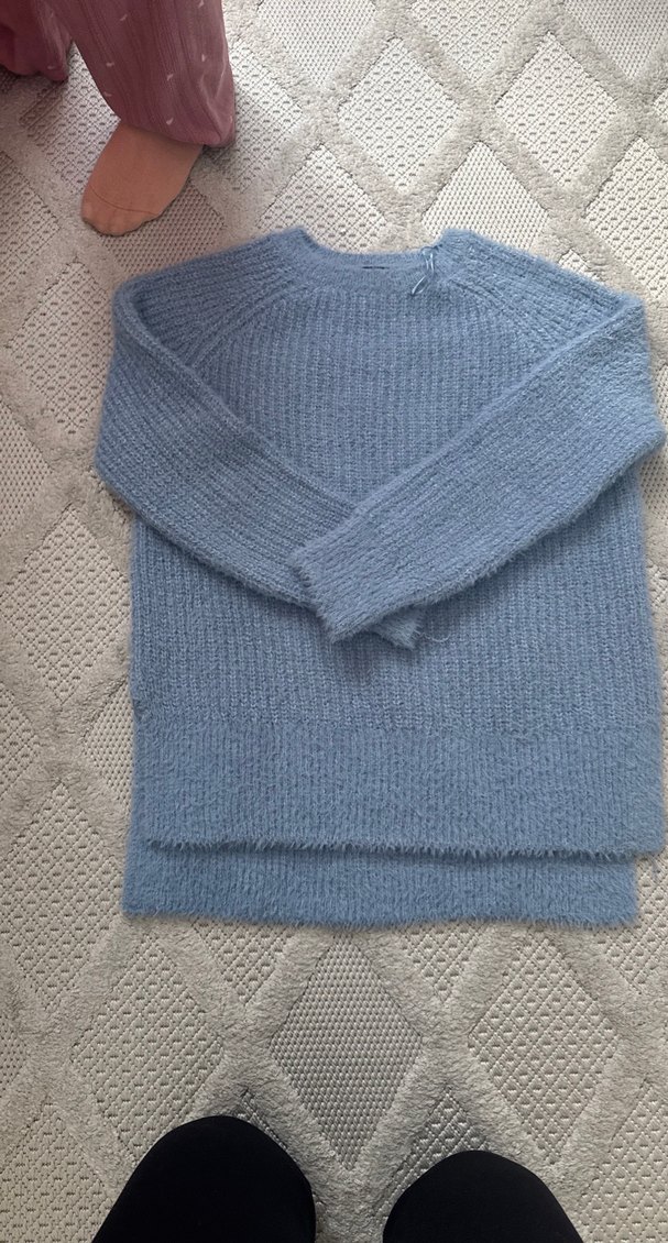 Mavi renkte, yuvarlak yakalı ve uzun kollu, bol kesim triko kazak. Rahat ve sade tasarımıyla günlük kullanıma uygundur.