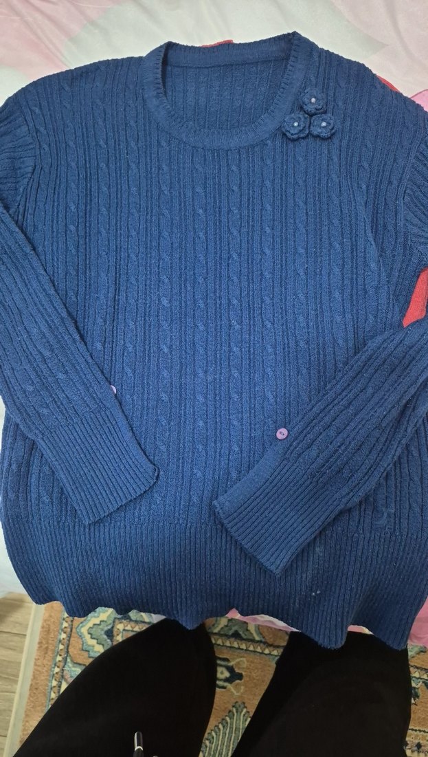 Mavi renkli, bisiklet yaka ve uzun kollu, triko kumaştan örülmüş kadın kazak. Salaş kesim ve midi boyda, gündelik rahat kullanım için uygundur.