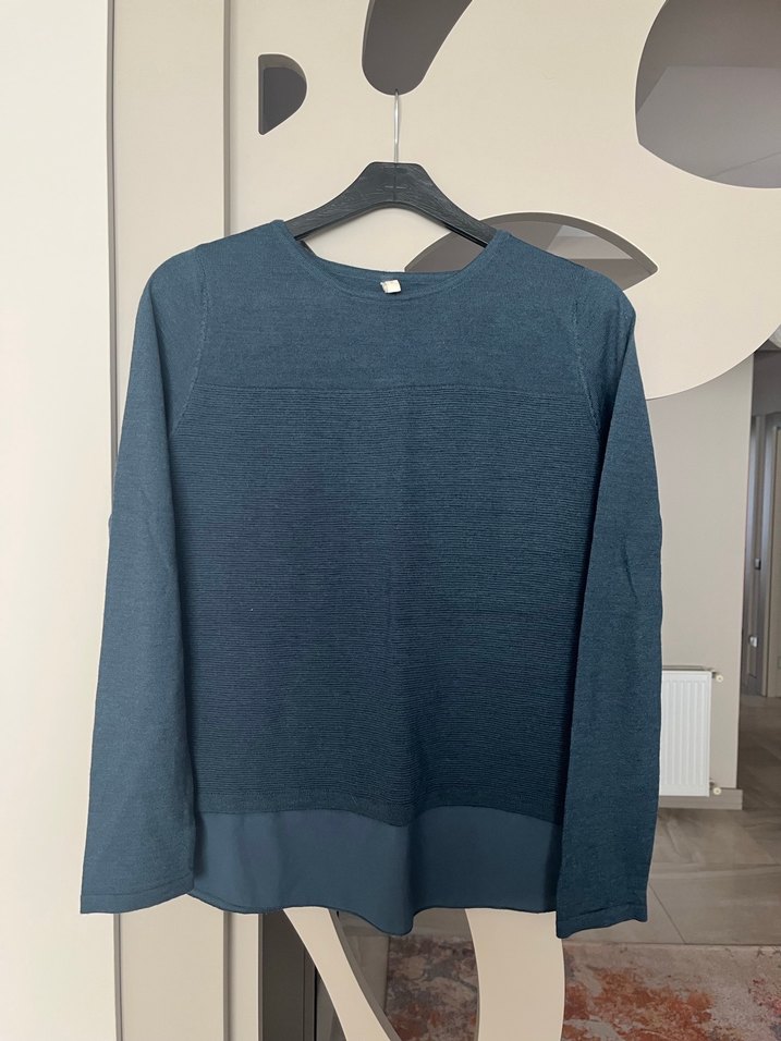 Mavi renkli, yün örme kumaştan, bisiklet yaka ve uzun kollu, rahat kesim ve normal midi boyda kadın kazak.