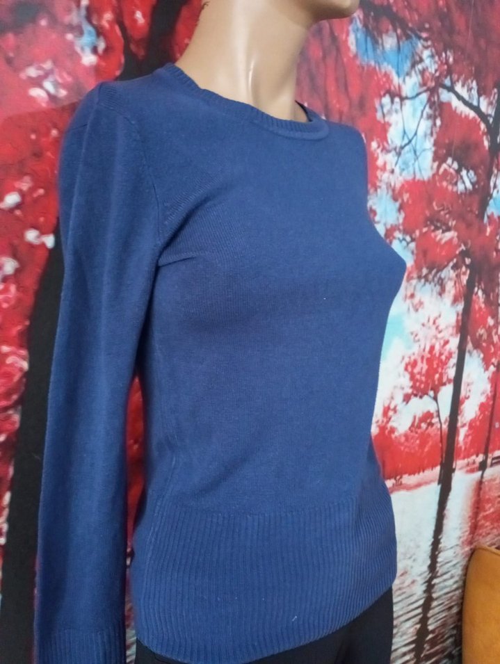 Fitted kesim, bisiklet yaka ve uzun kollu mavi triko kazak. Yumuşak ve sıcak kumaştan, günlük sokak stiline uygun.