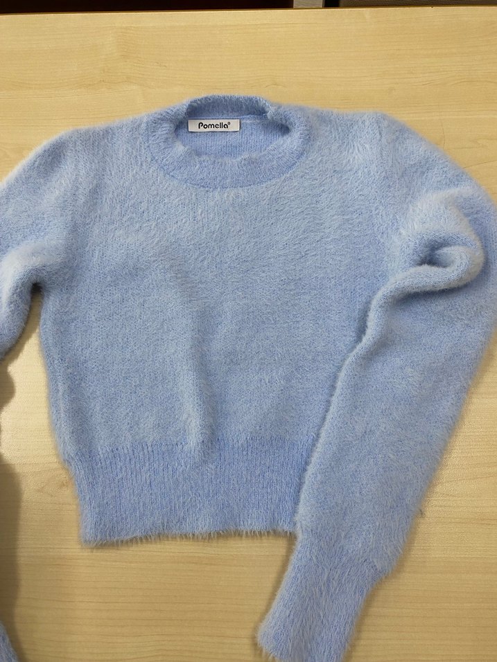 Mavi, bisiklet yaka, uzun kollu, triko dokuma, normal boy, sade ve rahat kesim kazak.