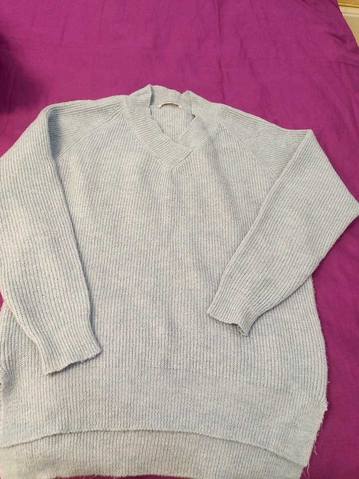 Mavi renkli, yuvarlak yaka ve uzun kollu, rahat kesim triko kazak. Günlük konfor için yumuşak örme kumaştan yapılmıştır.