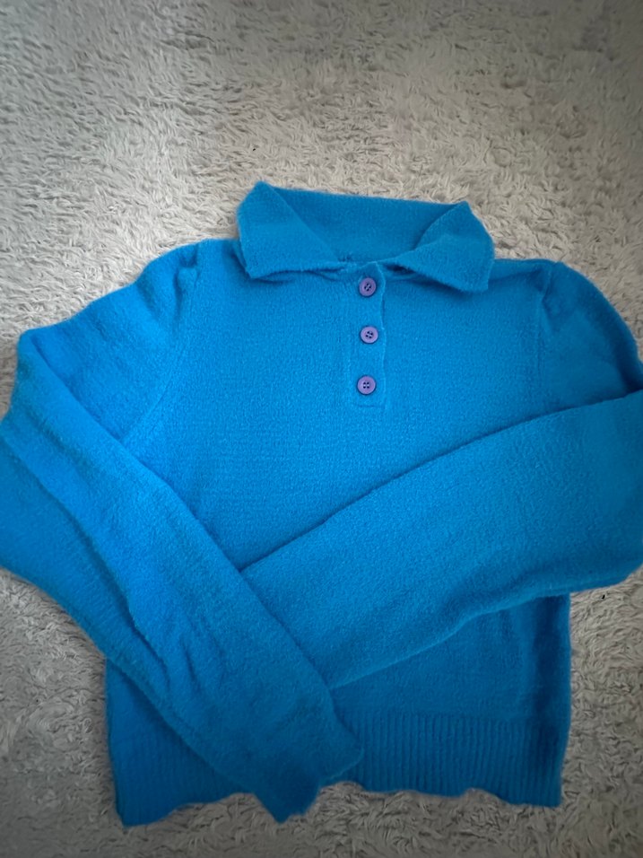 Mavi renkte kadın kazak, polo yaka ve uzun kollu. Yumuşak ve sıcak kumaştan, pastel tonlarda, rahat ve şık bir görünüm sunar.