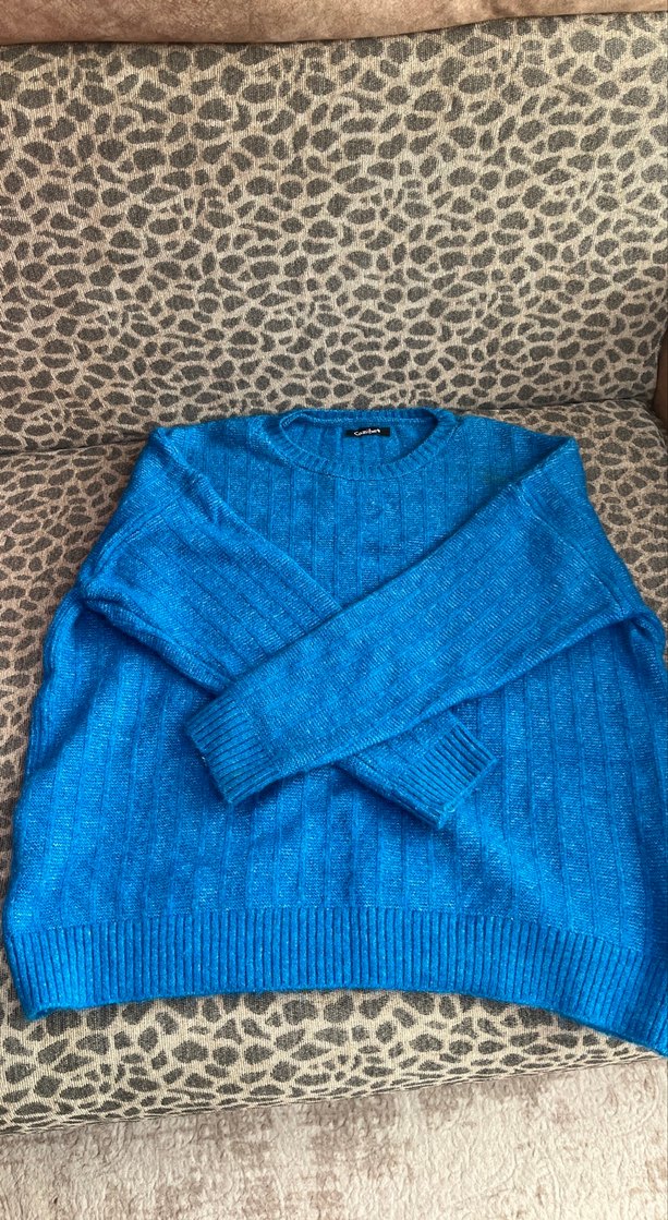 Uzun kollu, yuvarlak yaka, mavi renkli, rahat kesim triko kazak. Günlük kullanım için uygun, sokak stiline uyum sağlar.