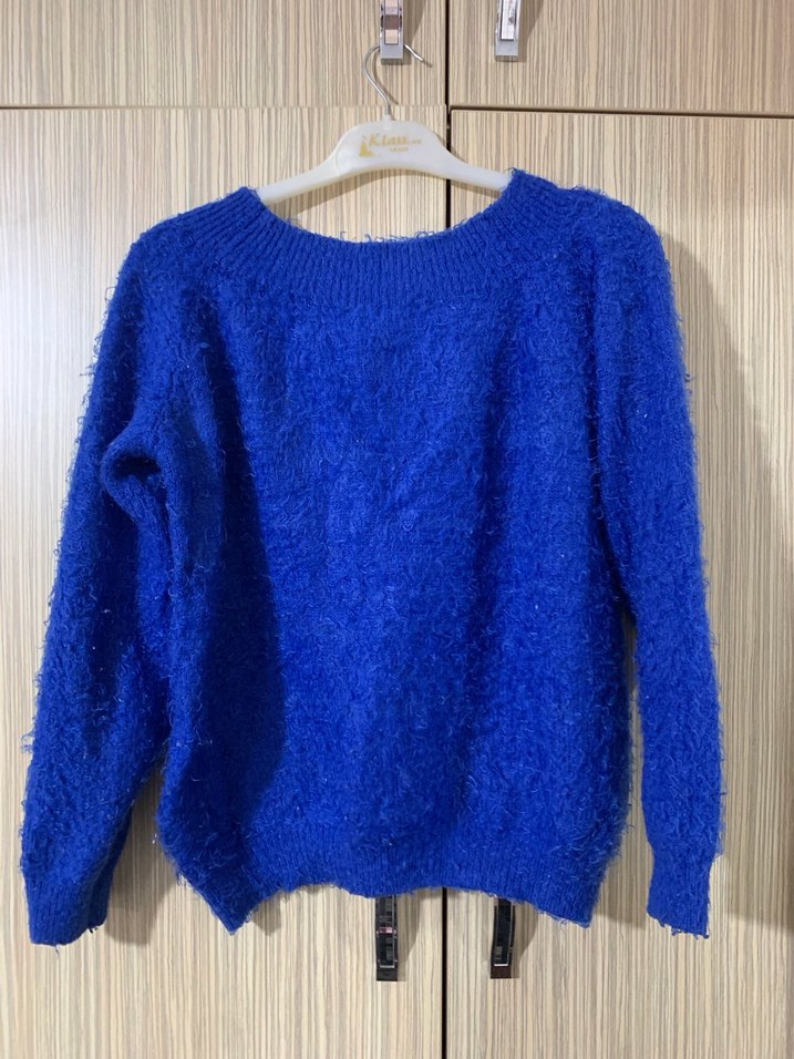 Mavi renkli, yuvarlak yakalı ve uzun kollu örme triko kazak. Rahat kesimi ve yumuşak dokusuyla günlük kullanım için uygundur.