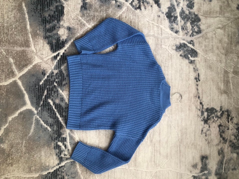 Mavi renkli, uzun kollu, triko kumaştan yapılmış, kadın kazak. Rahat ve deseniz, günlük sokak stiline uygun.