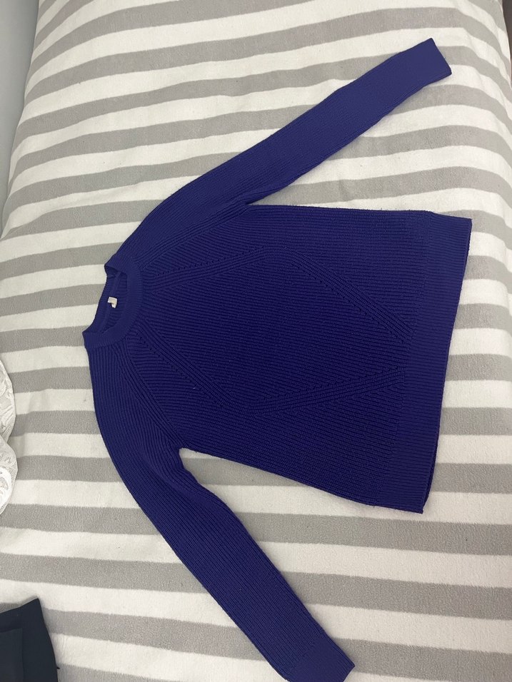 Fitted kesim, uzun kollu ve bisiklet yaka mavi kadın triko kazak. Yumuşak örgü kumaştan, günlük kullanım için uygun.