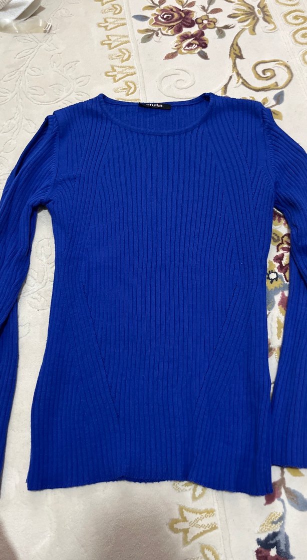 Mavi renkli, uzun kollu ve yuvarlak yakalı, vücuda oturan triko kadın kazak. Günlük ve sokak stiline uygun, normal boyda rahat bir tasarım. Omuz tedaylı