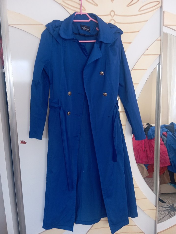Mavi uzun trençkot, düğmeli ve kesimli yakaya sahip. Uzun kollu, yumuşak ve sıcak kumaştan, günlük rahat sokak stili için uygundur. ön dövmeleri düşmüş
