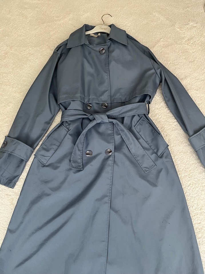 Mavi renkte, kemerli ve uzun kollu kadın trençkotu. Rahat kesimi ve kesik yaka detayıyla günlük kullanıma uygundur. Sentetik kumaştan üretilmiştir. ️