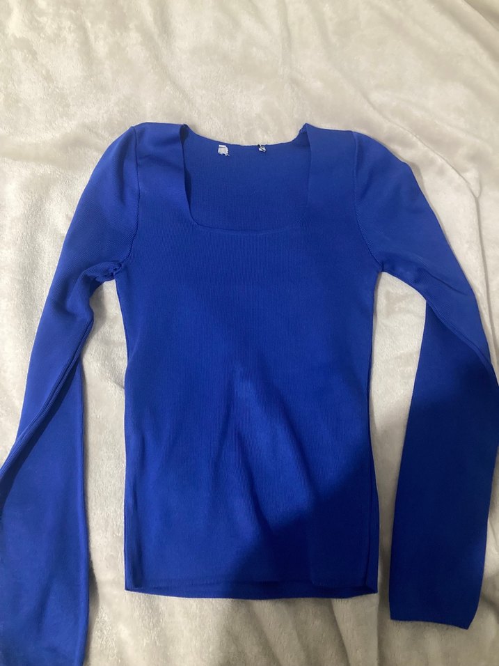 Fitted kesim, uzun kollu kadın kazak; yumuşak ve sıcak kumaştan, kare yaka ile. Parlak mavi rengi minimalist sokak stiline uygun, günlük kullanıma uygun.