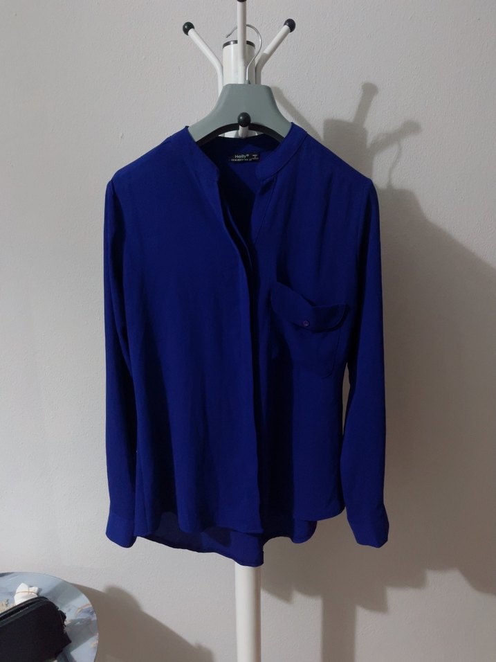 Mavi, uzun kollu, düğmeli ve yakalı gömlek. İpek gibi dokusu ve bol kesimiyle günlük kullanıma uygun, minimalist ve sokak stiline uygun.
