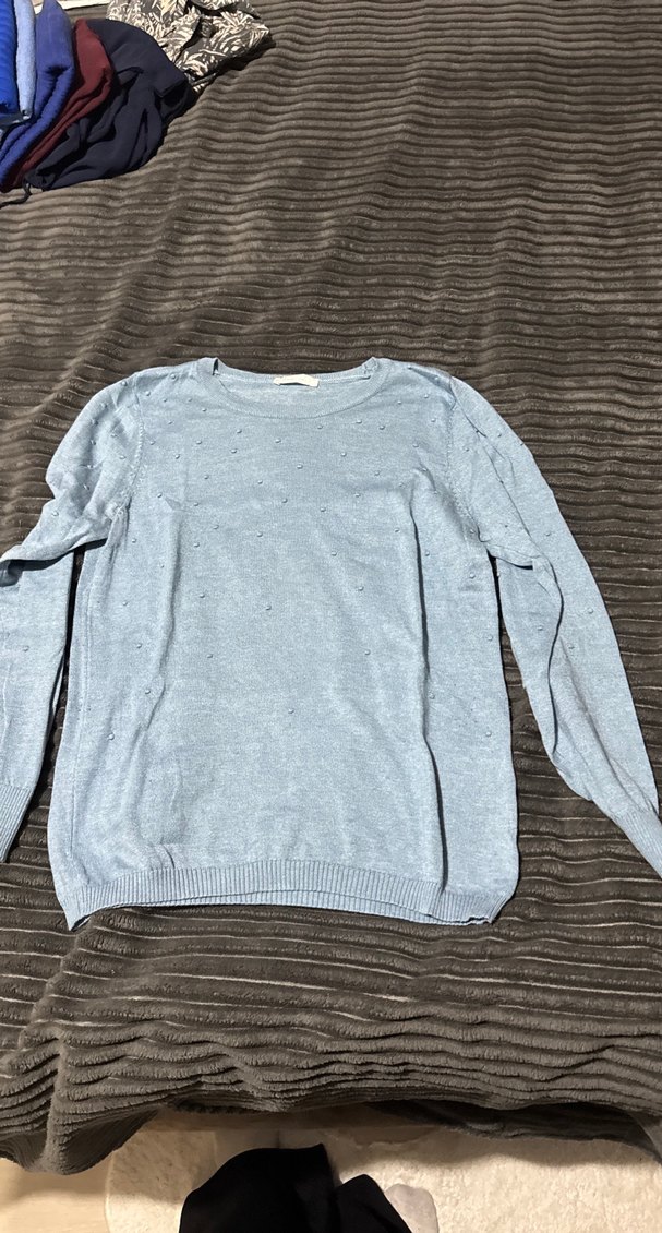 Mavi renkli, uzun kollu ve bisiklet yaka triko kazak, yumuşak keten kumaştan örülmüştür. Rahat ve bol kesimiyle normcore tarzına uygundur.