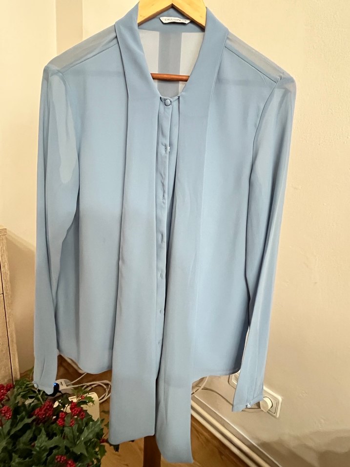 Pastel mavi renkte, uzun kollu ve yakalı düğmeli kadın gömleği. İpek gibi yumuşak kumaştan, regular kesim ve uzun boyda, ofis için uygun sade ve çağdaş tarzda. Hiç giyilmedi