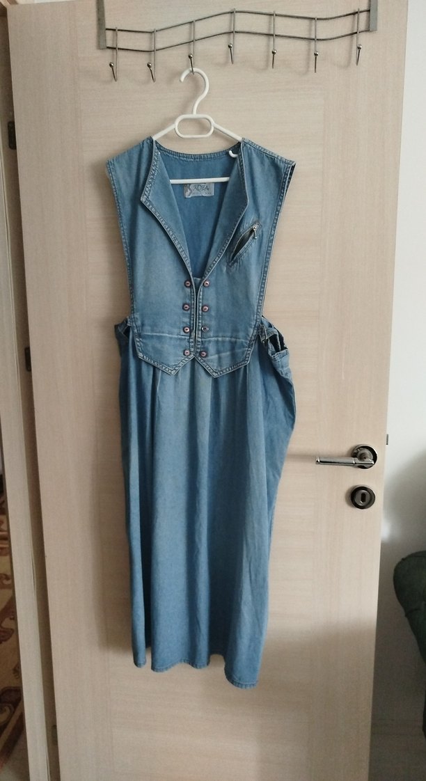 Mavi kot kumaştan yapılmış, düğmeli ön kısmı ve yakalı, kolsuz uzun kadın tulumu. Rahat kesimi ve vintage tarzıyla günlük kullanıma uygundur.
