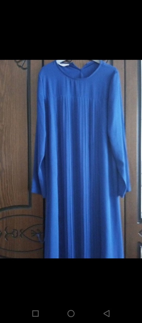 Mavi uzun elbise, pilili detaylara, uzun kollara ve yuvarlak yakaya sahiptir. Sentetik kumaştan üretilmiş bol kesim, günlük kullanım için uygundur.