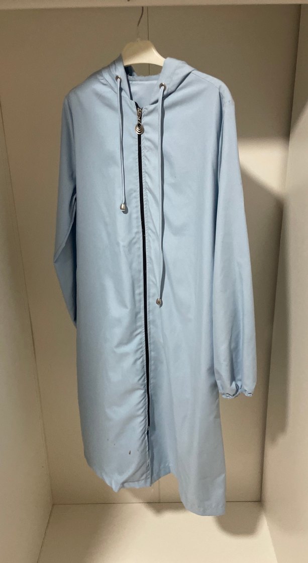 Pastel mavi renkli, uzun kesim, bol fit kadın yağmurluğu. Fermuarlı ve notched lapel yakalı, sentetik kumaştan üretilmiş, günlük kullanıma uygun minimalist tarzda.