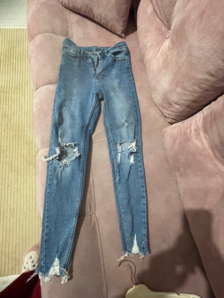 Kadınlar için mavi slim fit denim pantolon, midi boy ve yırtık detaylara sahip. Günlük sokak modası için uygun, çok rahat bir pantolon esnektir . Belli olmayan lekeleri var . Fotoğrafta bellirttim .