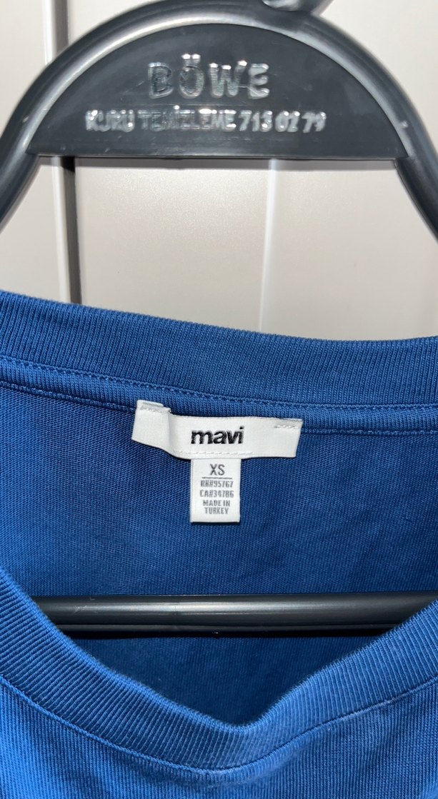 Mavi markalı, crop uzun kollu, bisiklet yaka ve fermuarlı detaylı, fitted kesim . Koyu mavi denim kumaştan, günlük kullanıma uygun.