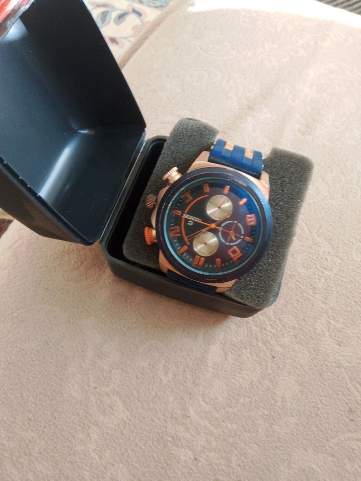 Erkek kol saati, koyu mavi kadranlı, çağdaş tasarımlı ve günlük kullanıma uygun. Çoklu alt kadranlar ve koruyucu kutu ile sunulur. ⌚
