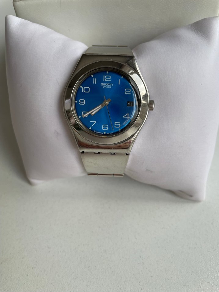 Mavi kadranlı, beyaz rakamlı ve tokalı gri metal kayışlı kadın kol saati. Minimalist ve klasik bir tasarıma sahiptir. ⌚ Saat orijinaldir az kullanılmıştır herhangi bir kusuru yoktur. kordon boyu 19 santimdir. Swatch markadır .