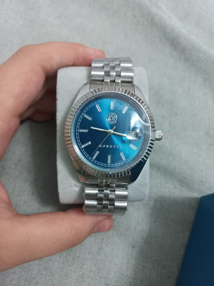Mavi kadran ve tarih göstergesine sahip bu erkek saati, gri metal bilezikle modern klasik ve iş tarzını bir araya getiriyor. ⌚