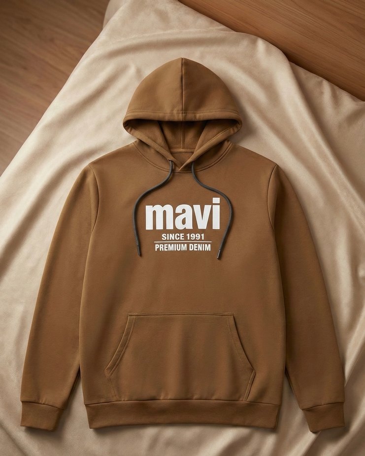 Kahverengi kapüşonlu sweatshirt, uzun kollu ve normal kesimdir. Yumuşak süet kumaştan üretilmiş olup önünde 'mavi PREMIUM DENIM' baskısı vardır.