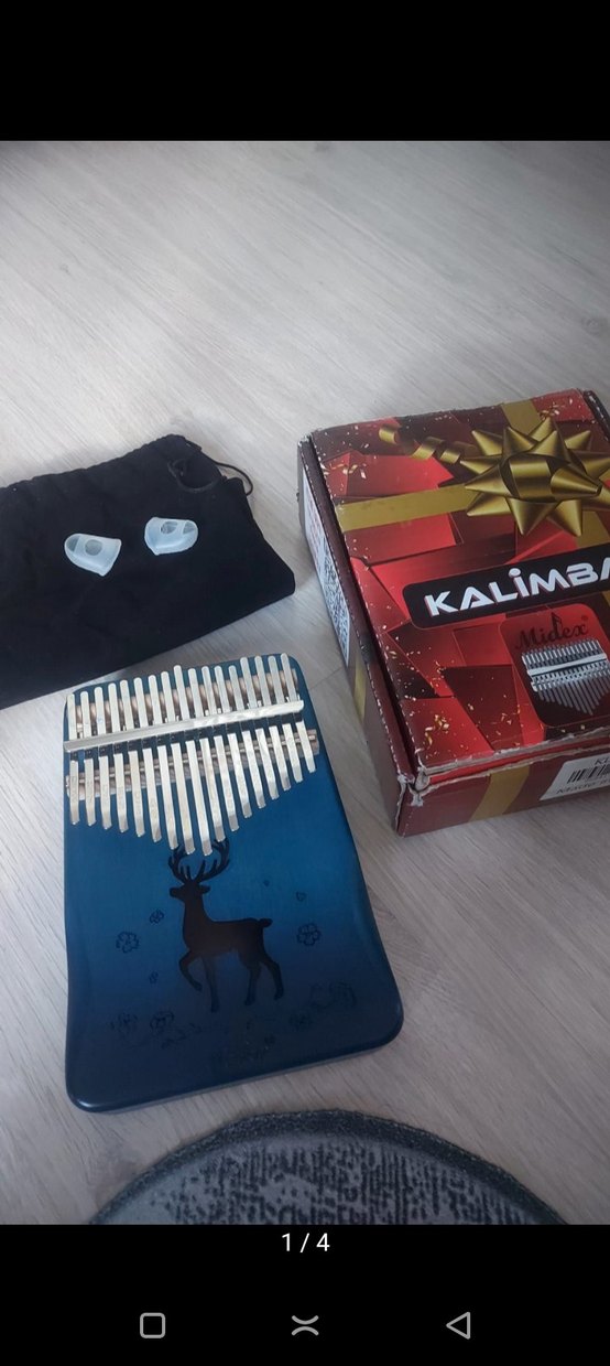 Koyu mavi kalimba, metal parmak tırnakları ve geyik desenine sahiptir. Taşıma çantası ve başparmak koruyucuları ile gelir.