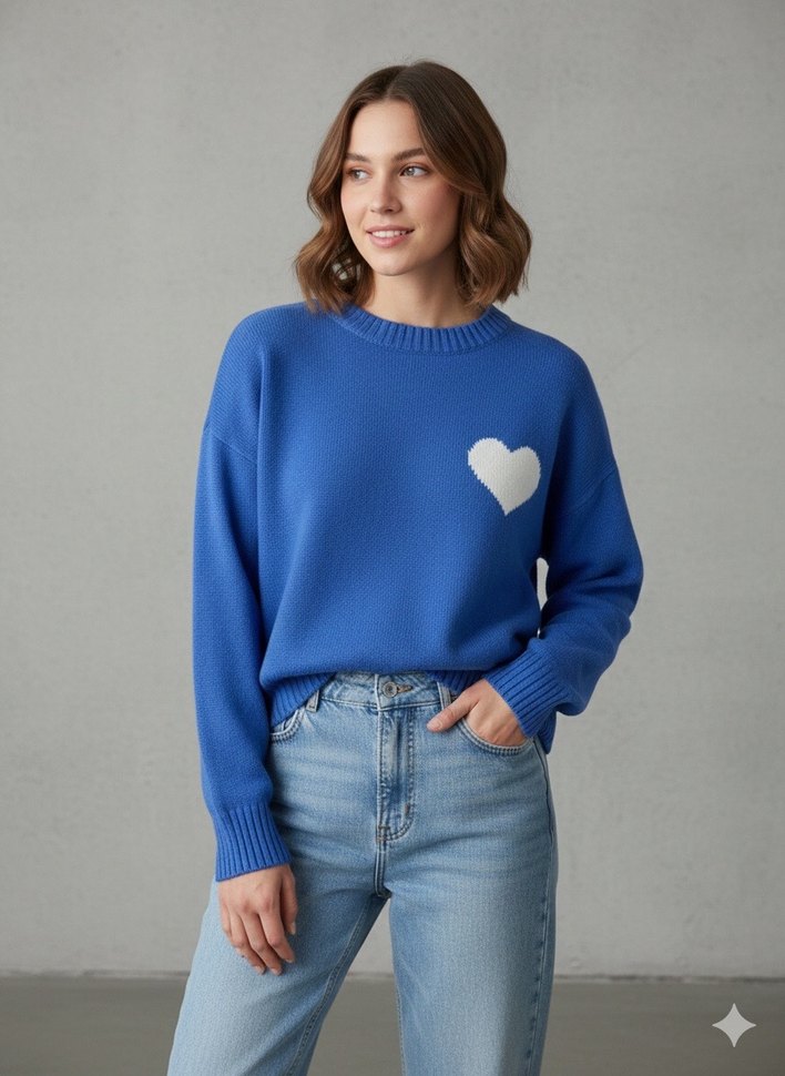 Mavi renkli, beyaz kalp desenli triko kazak. Yuvarlak yaka, uzun kollu ve bol kesimdir. Günlük sokak stiline uygundur. Az kullanıldı