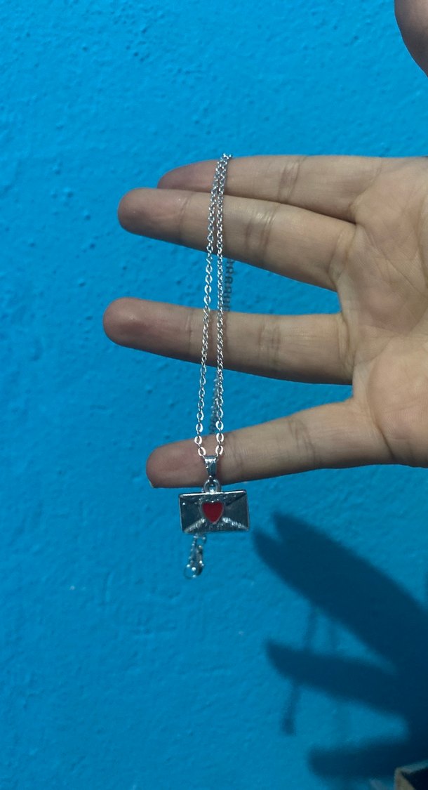 Mavi zeminli zarf şeklinde, kırmızı kalp detaylı zincir kolye. Normal midi uzunluğunda, sade ve romantik akşamlar için uygun.