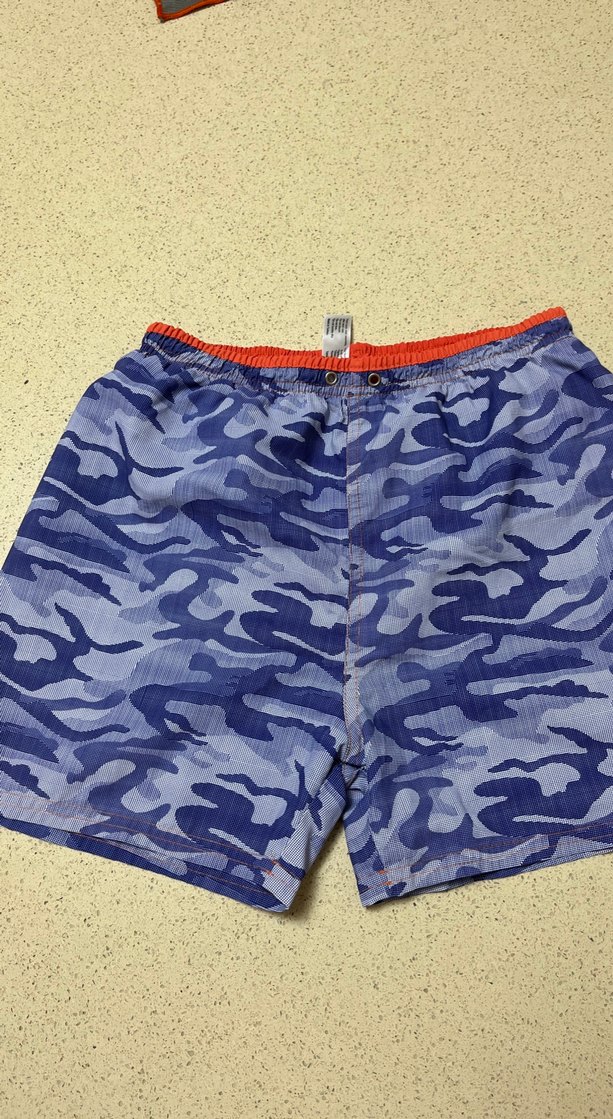 Mavi kamuflaj desenli, sentetik kumaştan yapılmış, bol kesim erkek şort, renkli ve deniz şortu
