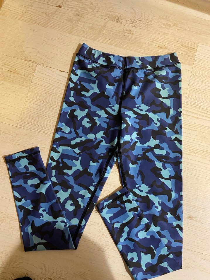 Elastik sentetik kumaştan, koyu mavi kamuflaj desenli, normal boy, kadınlar için dar kesim tayt. Spor ve günlük sokak stili için uygundur. ♀️